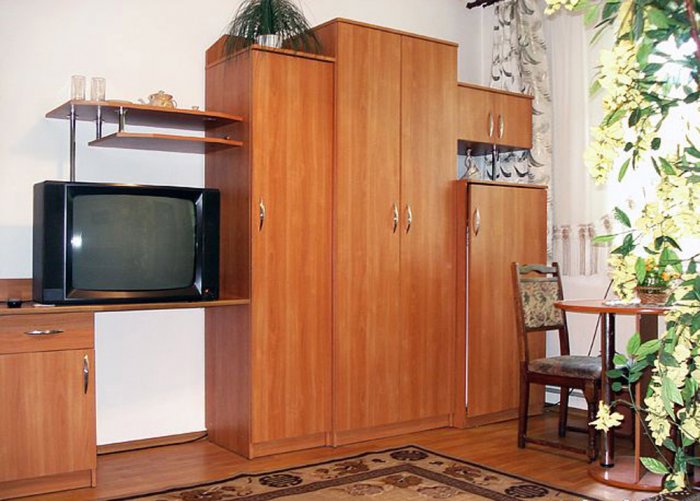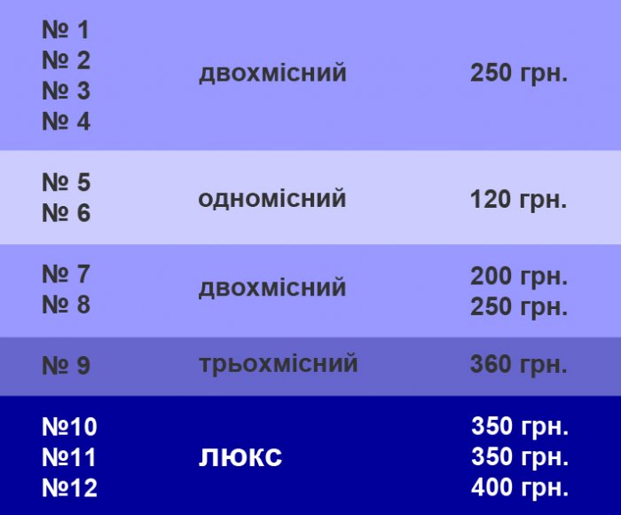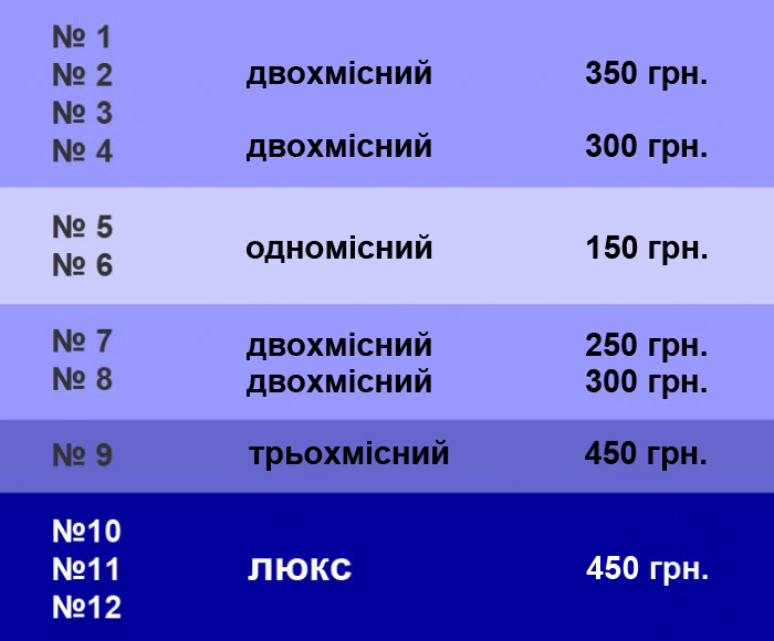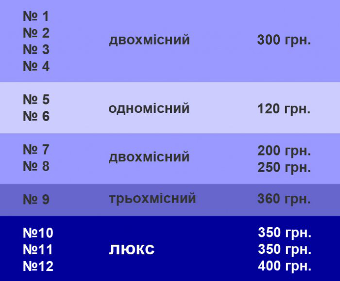 - 3 номери "Люкс" (прихожа, спальня, телевізор, холодильник, санвузол, душкабінка)